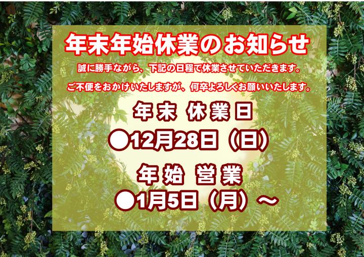 平素は格別のご高配を賜り厚く御礼申し上げます。 年末年始の休業につきまして、下記の通りお知らせいたします。 お客様には、大変ご迷惑をおかけしますが、何卒ご了承いただきます様お願い申し上げ...